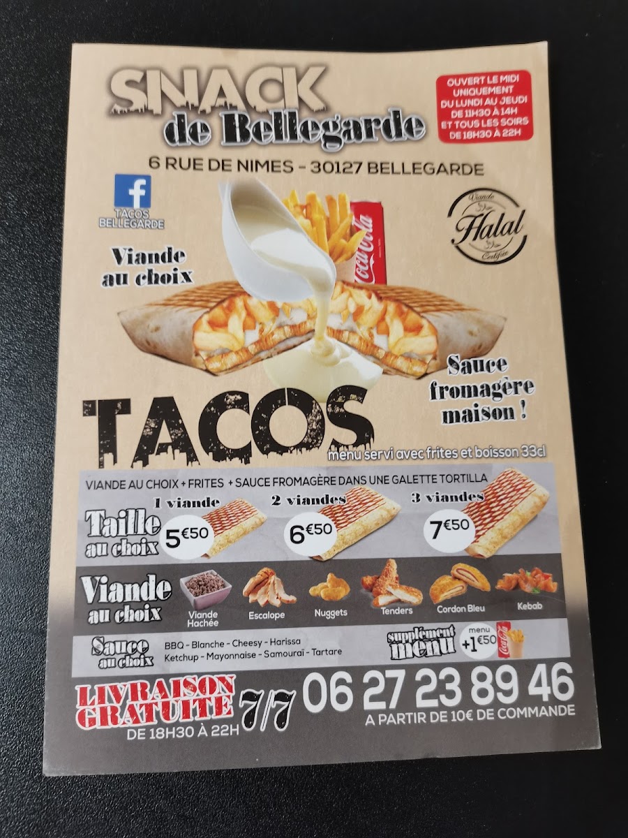 Welcome to Snack et tacos de Bellegarde, a hidden gem located at 6 Rue de Nîmes, 30127 Bellegarde, France. This vibrant eatery specializes in delicious tacos and mouth-watering snacks, perfect for food lovers seeking a unique dining experience. Customers rave about the quality of the products, with voices like Evan Growth praising the excellent tacos and attentive staff.
